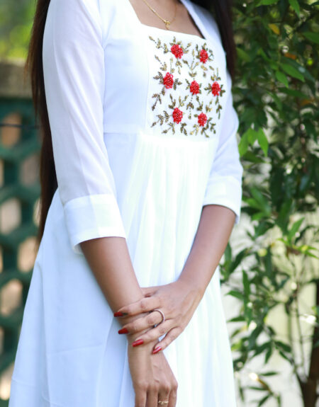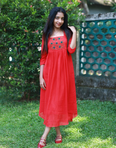 Embroidery: Striking contrast floral pattern (Crimson Red and Deep Green) for a refined holiday charm.