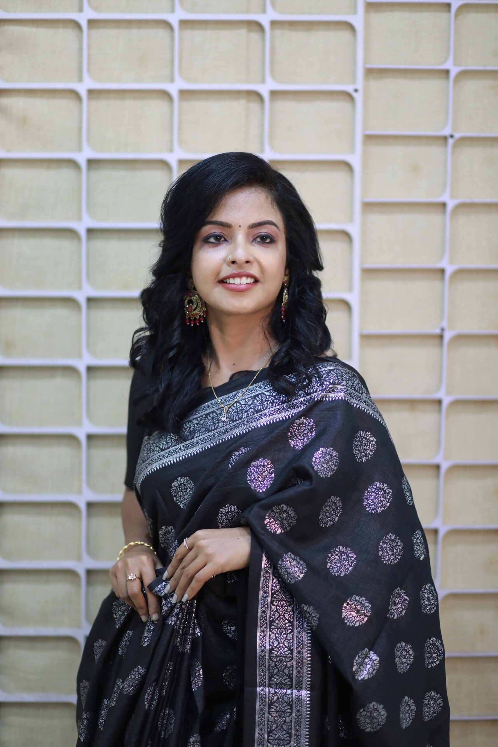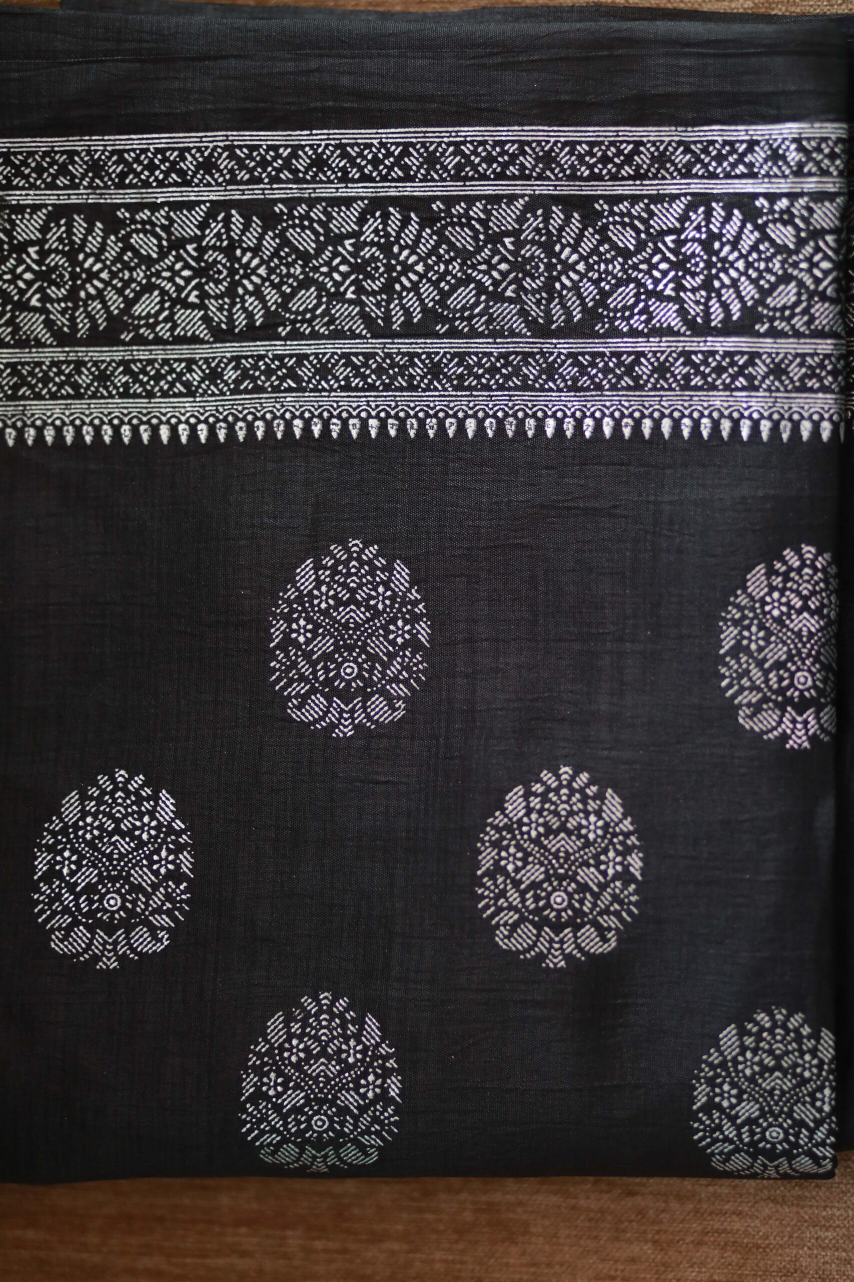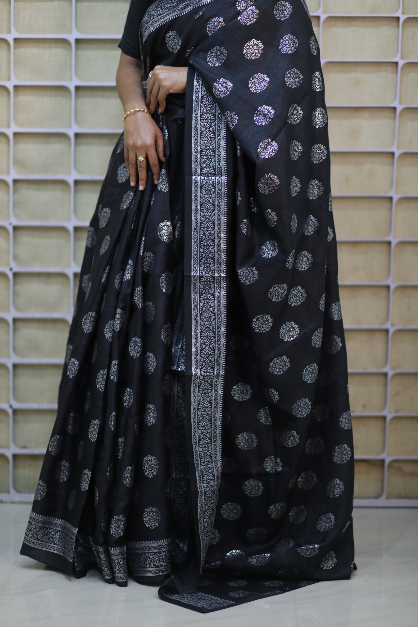 Artistic Design: This saree features a deep midnight black base embellished with intricate silver foil prints that shimmer with every movement.