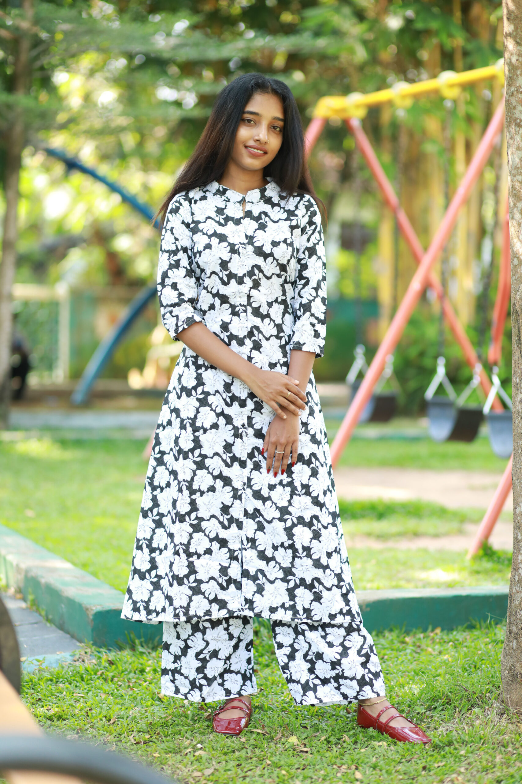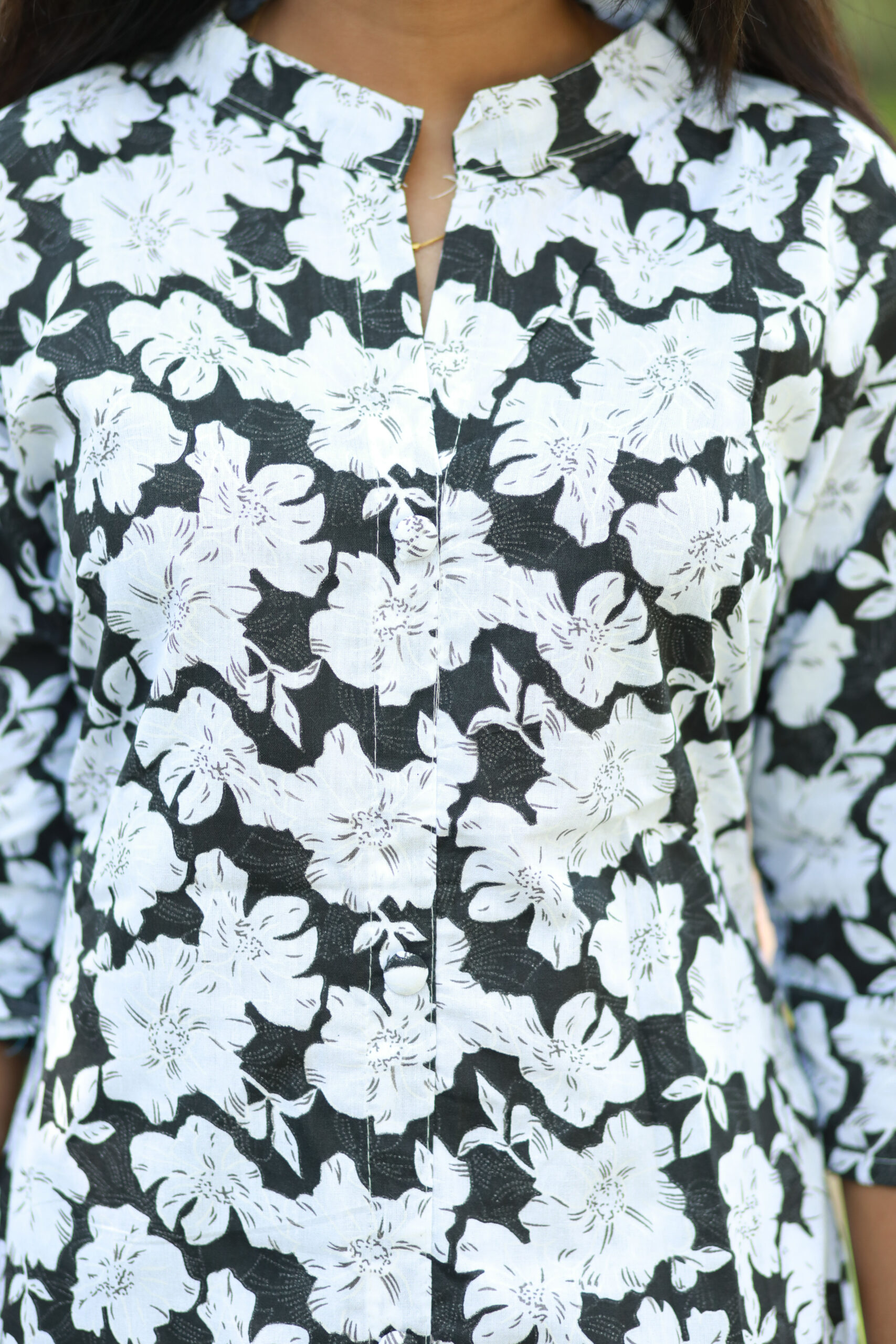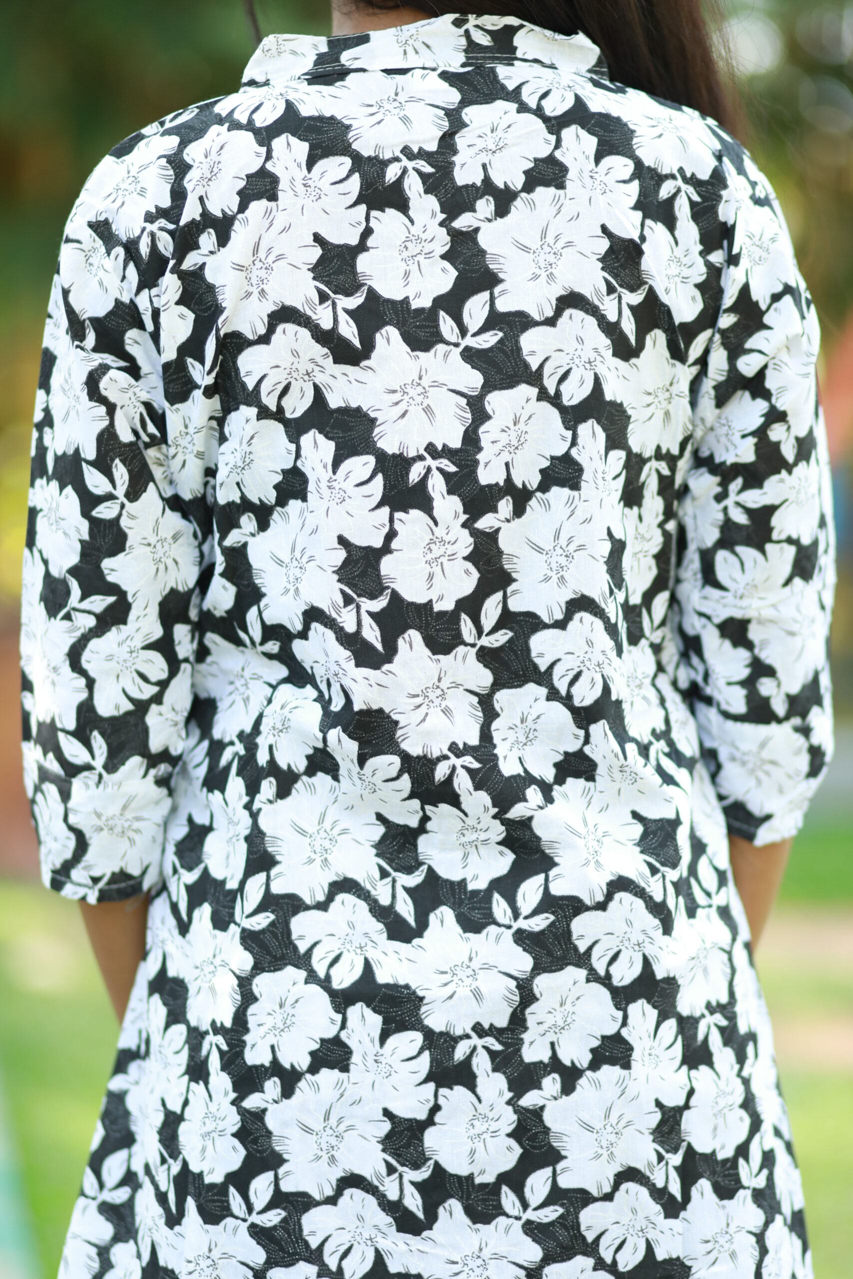 Grace meets everyday elegance in our Classic Blossom Co-ord Set. Featuring a classic black base adorned with soft ivory floral prints, this refined ensemble brings timeless charm to contemporary comfort. The straight-cut kurta is designed with a neat mandarin neckline and three-quarter sleeves, paired with matching wide-leg pants for a fluid, balanced silhouette.