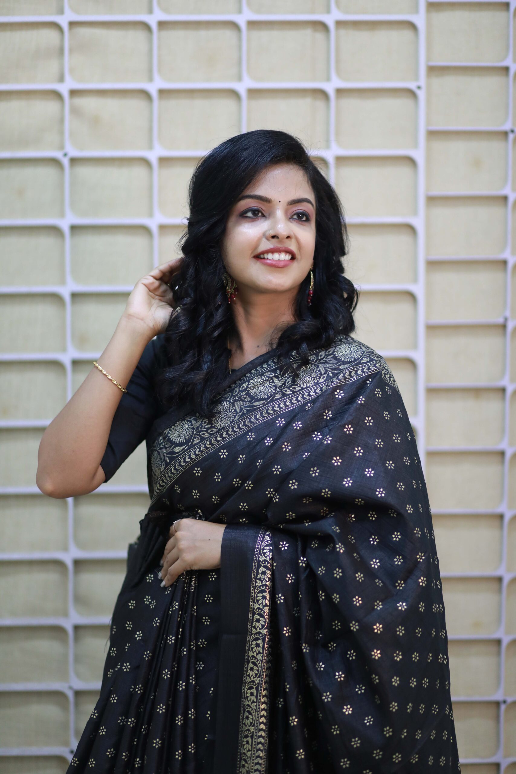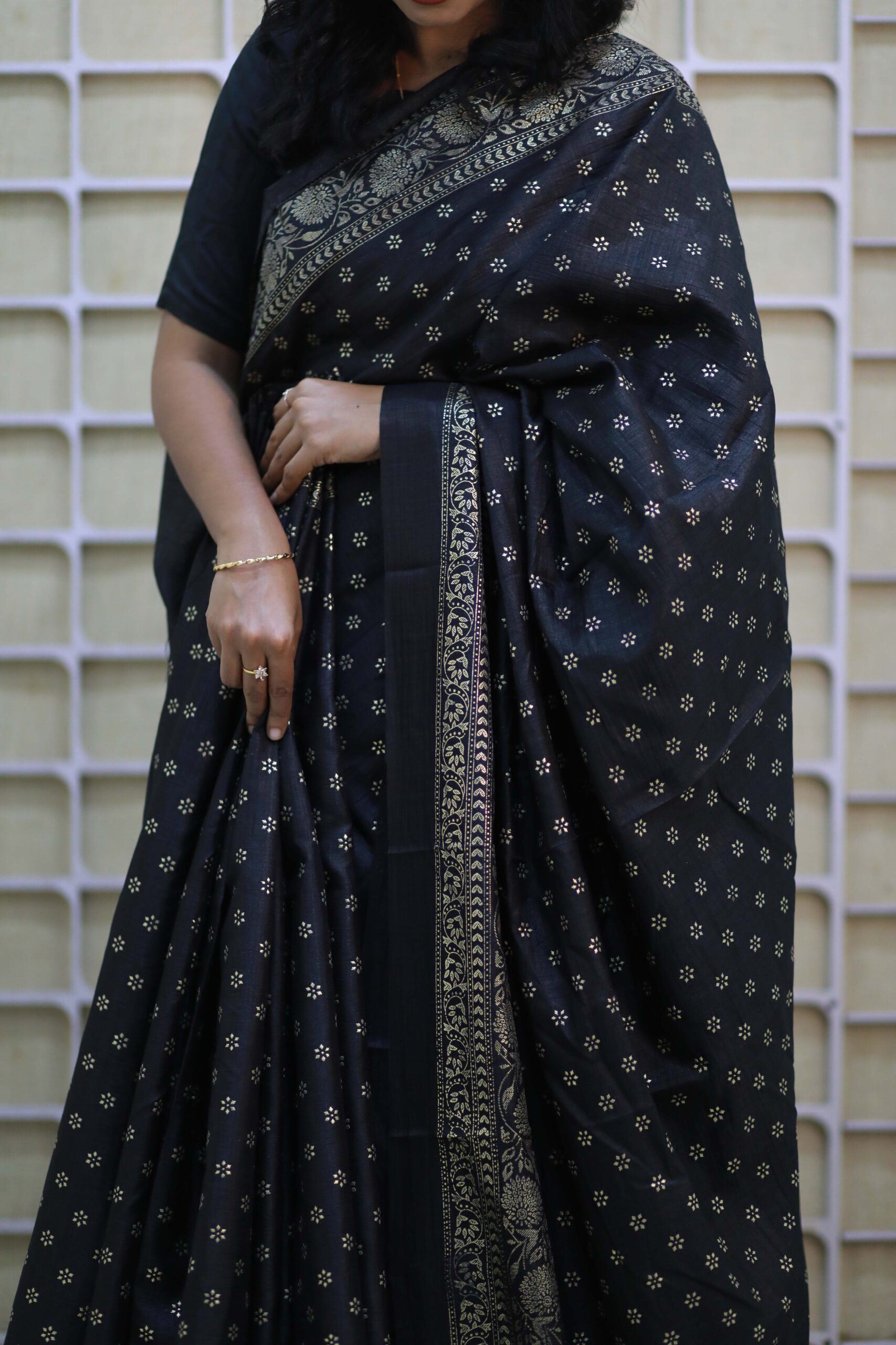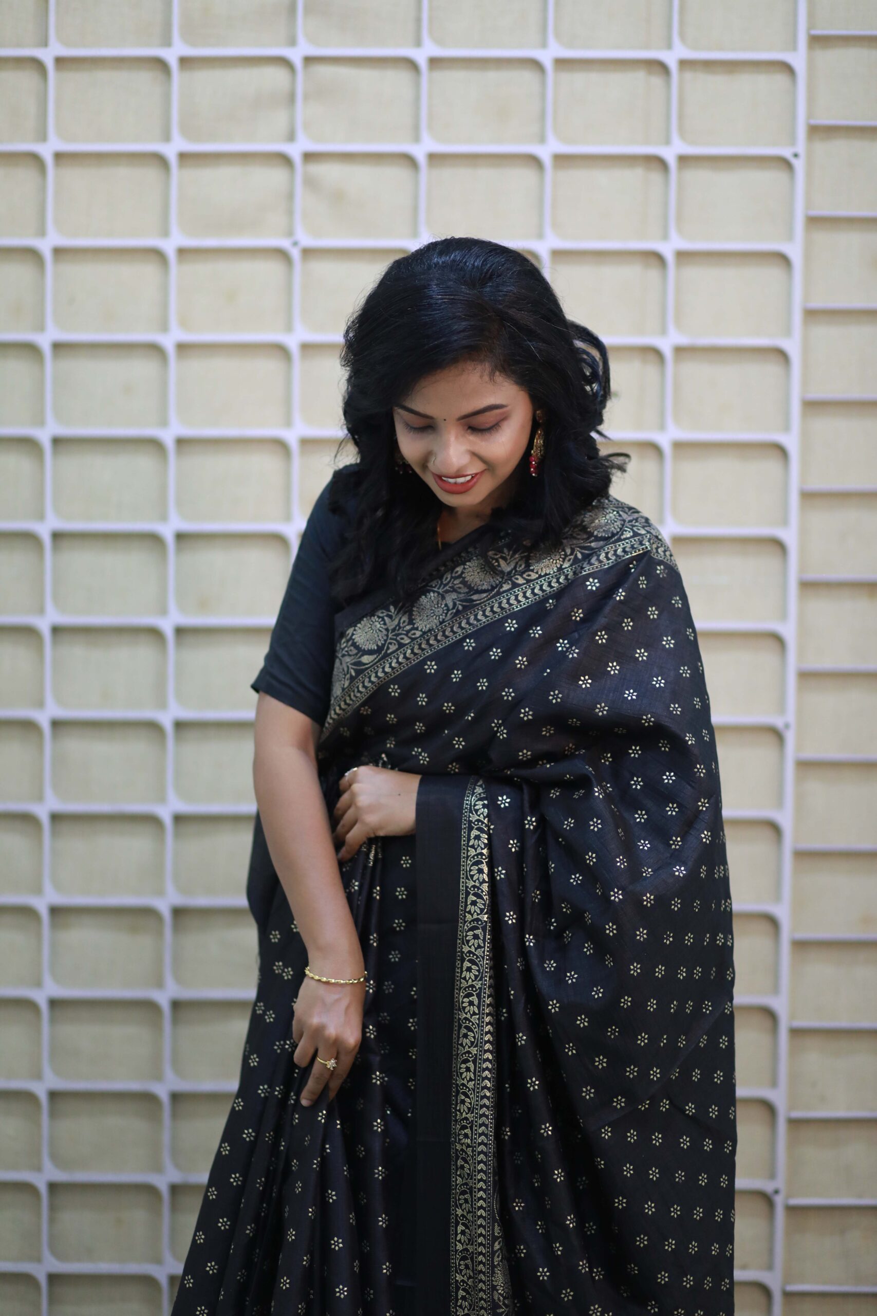 This sophisticated GRACE Saree features a deep black base adorned with intricate gold foil prints that shimmer with every movement. The body is designed with delicate “Butta” patterns, while the border and pallu showcase rich, traditional motifs for a truly regal finish. Crafted from a premium material with a subtle luster, it offers both comfort and high-end style, making it an ideal choice for weddings, festivals, and formal evening events. The saree comes complete with a matching solid black blouse piece to ensure a sleek and coordinated look.