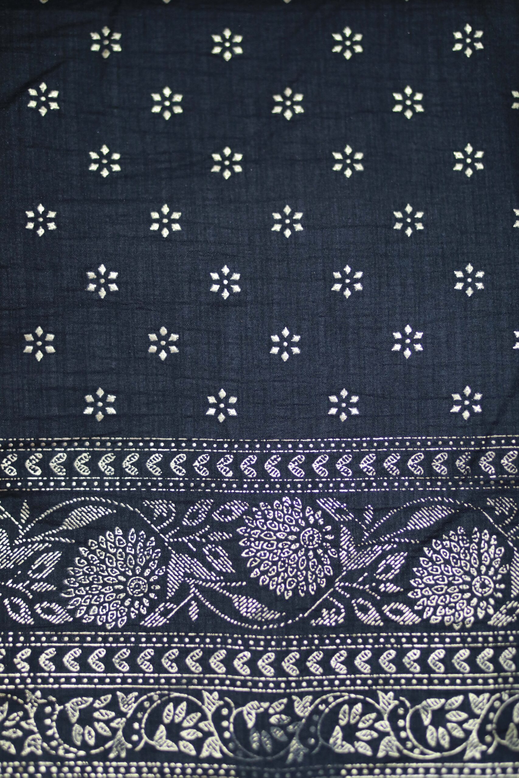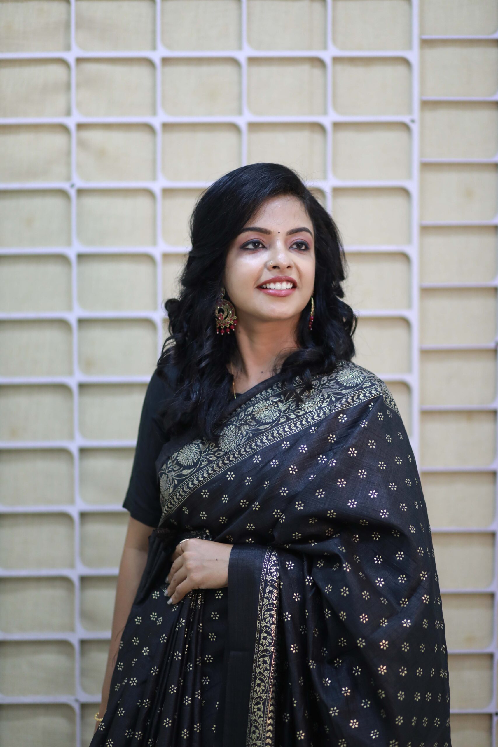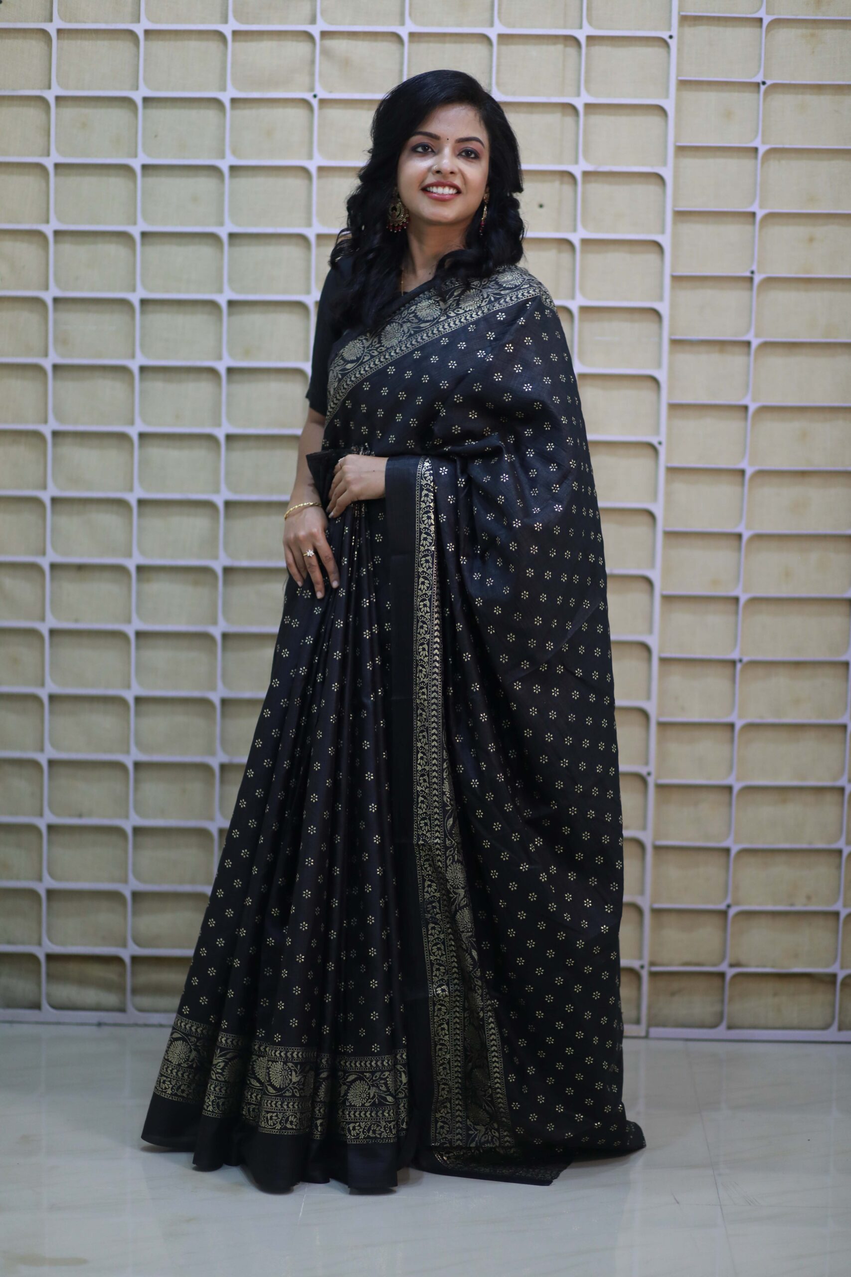 This sophisticated GRACE Saree features a deep black base adorned with intricate gold foil prints that shimmer with every movement. The body is designed with delicate “Butta” patterns, while the border and pallu showcase rich, traditional motifs for a truly regal finish. Crafted from a premium material with a subtle luster, it offers both comfort and high-end style, making it an ideal choice for weddings, festivals, and formal evening events. The saree comes complete with a matching solid black blouse piece to ensure a sleek and coordinated look.