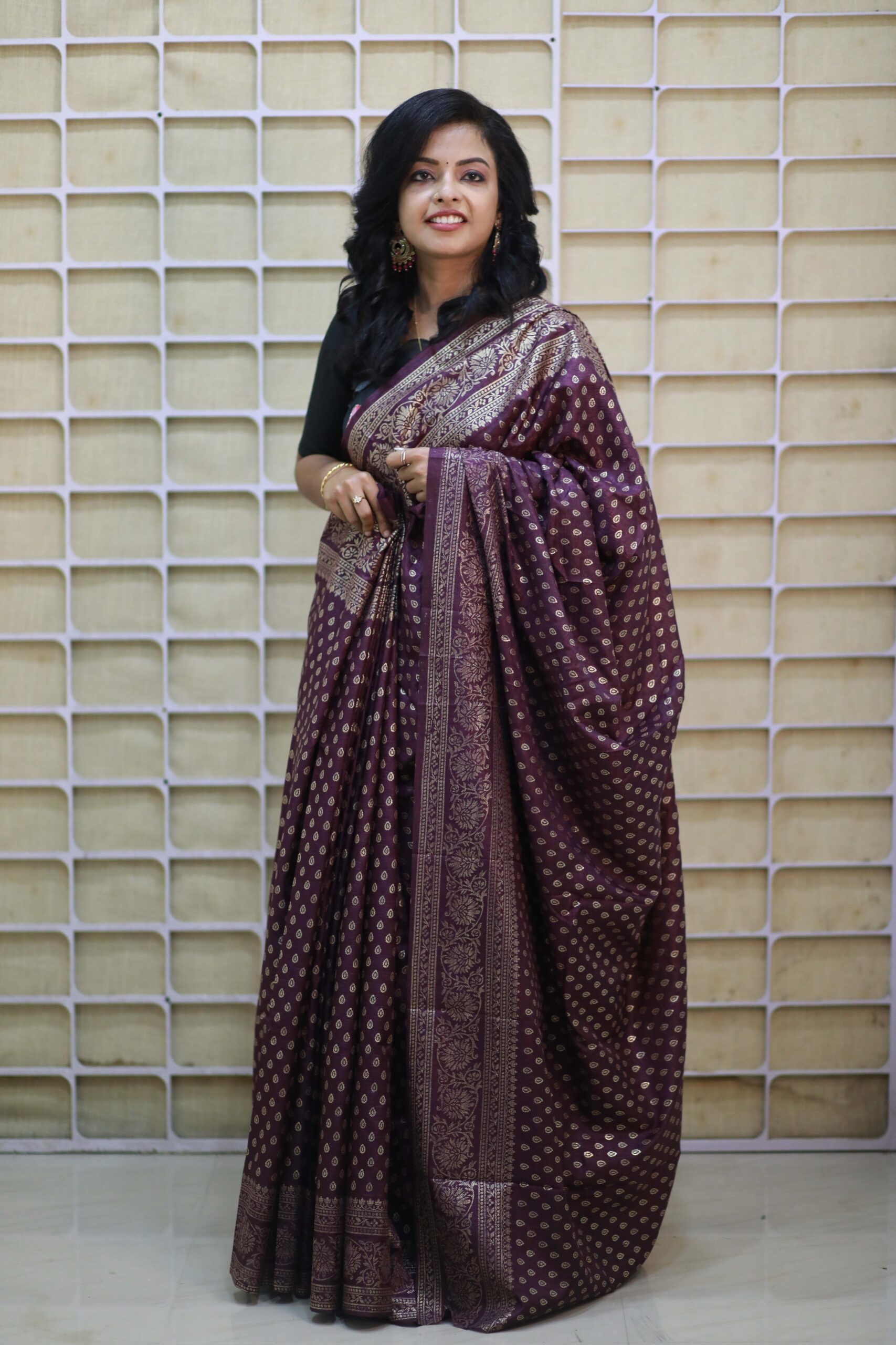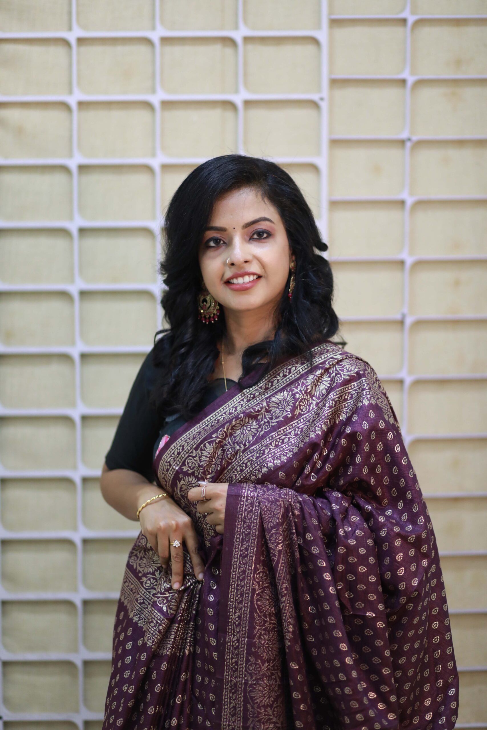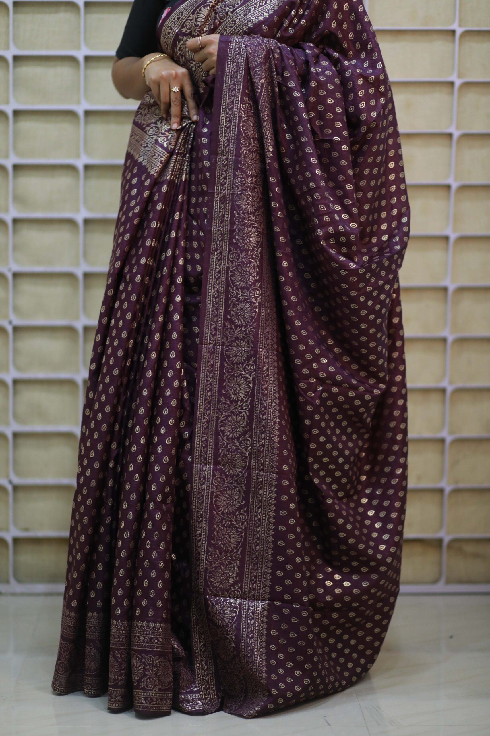 Elevate your festive wardrobe with this breathtaking Grape saree. Crafted from a soft, fluid fabric that drapes effortlessly, it features intricate gold foil-printed motifs that catch the light with every movement. The wide, ornate border and matching pallu showcase traditional floral patterns, offering a timeless aesthetic.