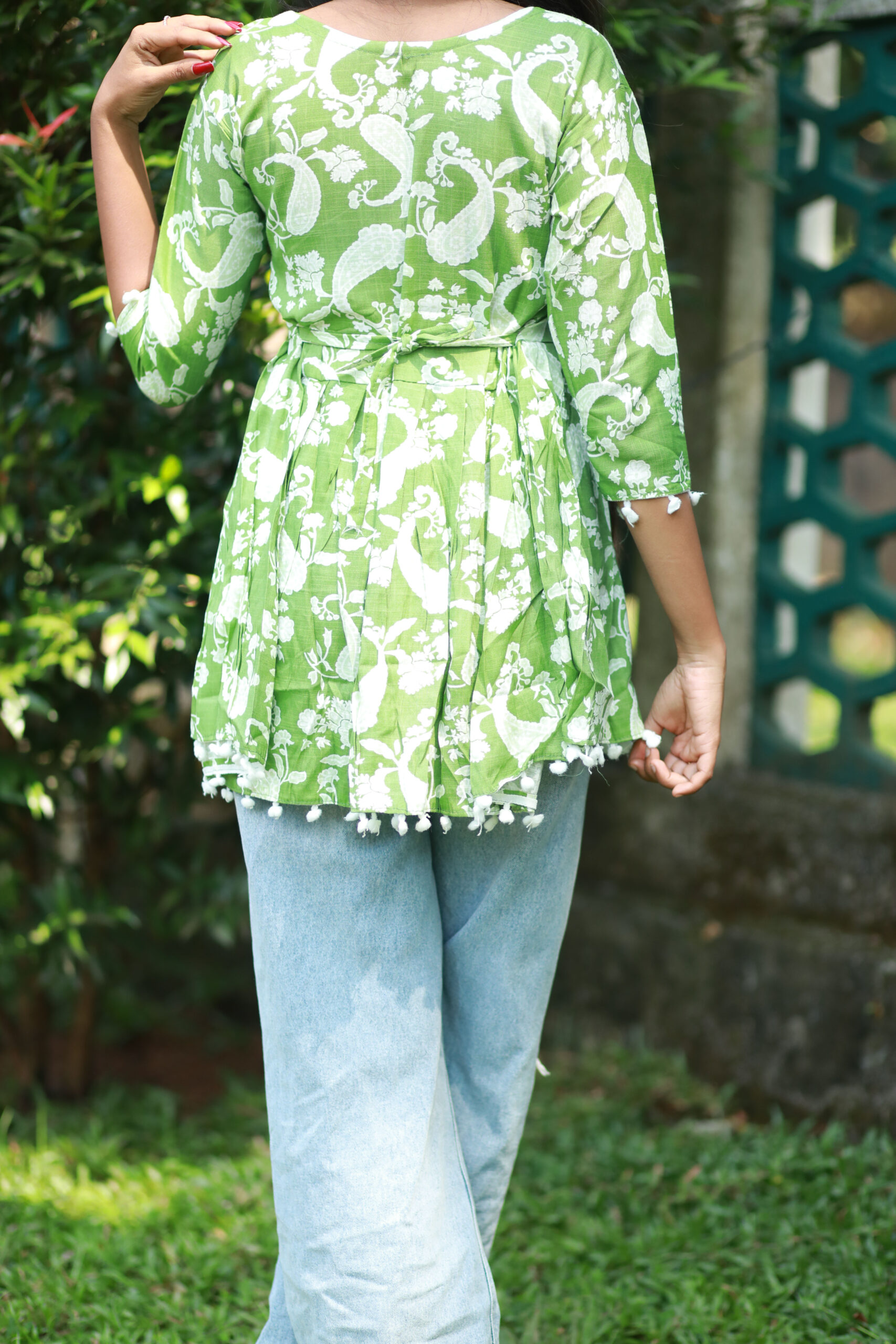 This is a vibrant green top made from a soft cotton mix. It features an all-over nature-inspired print and is shaped with a flattering, feminine peplum hem that flares out at the waist.