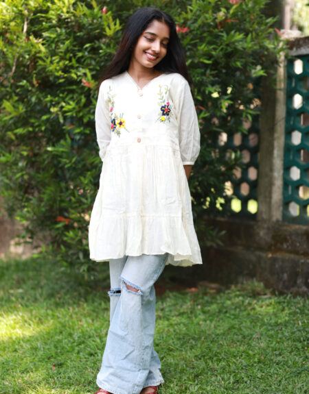 - Embroidery Detail: Features beautiful, multi-colored floral thread work across the yoke/chest.