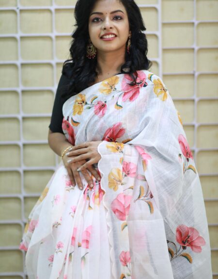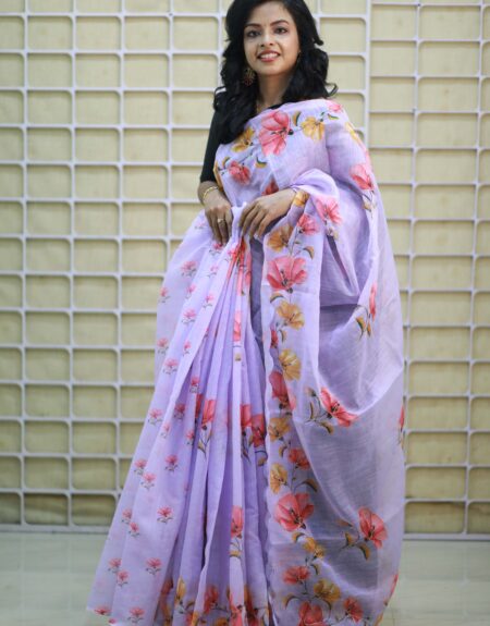 “Exude soft elegance in our MARIYAM Saree. Crafted from a high-quality linen-cotton blend, this saree features a refreshing lavender palette brought to life by vibrant, oversized floral motifs and a delicate scalloped edge. Complete with a matching lavender floral-detailed blouse, it is the perfect fusion of contemporary style and traditional grace.”