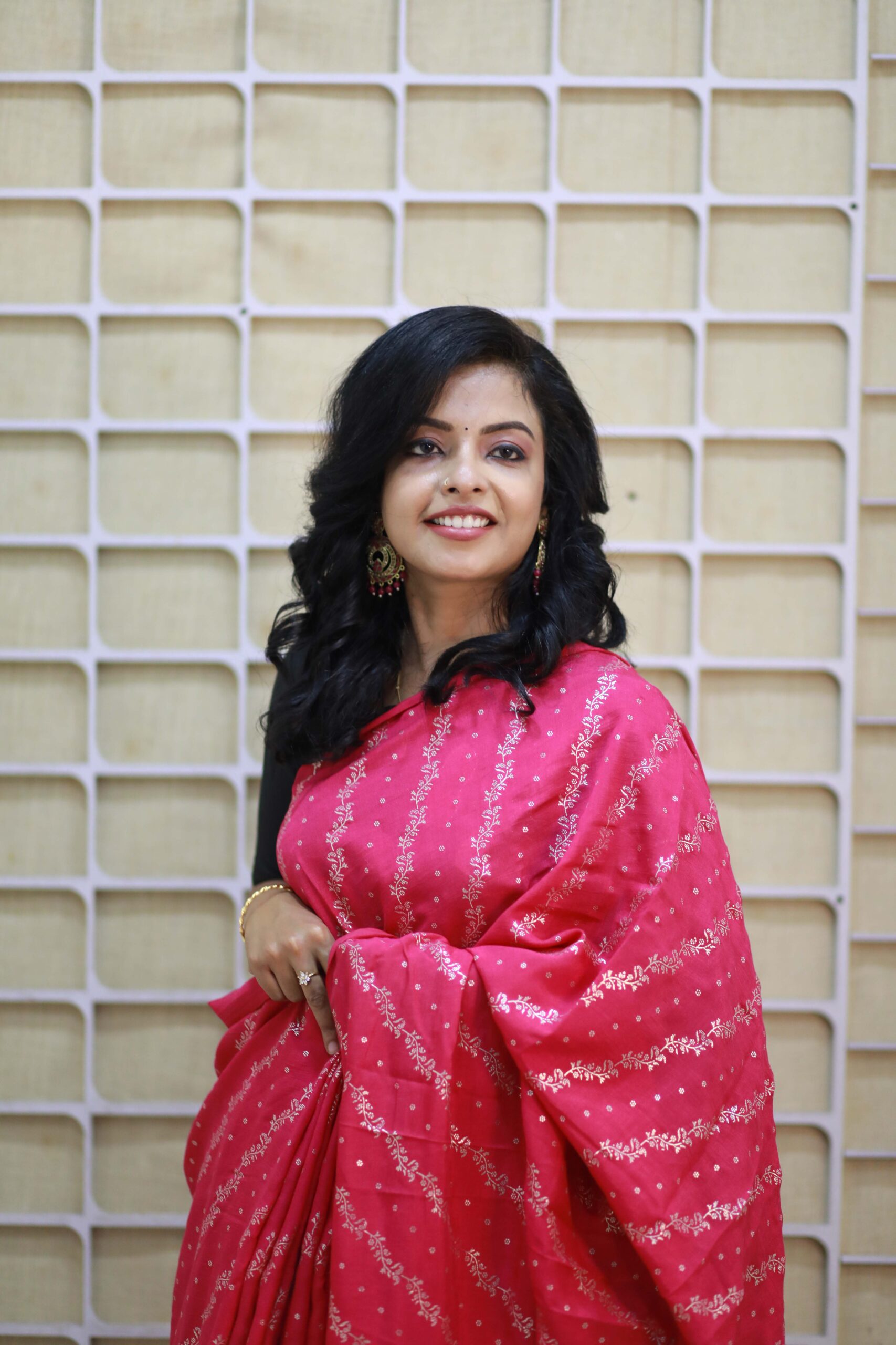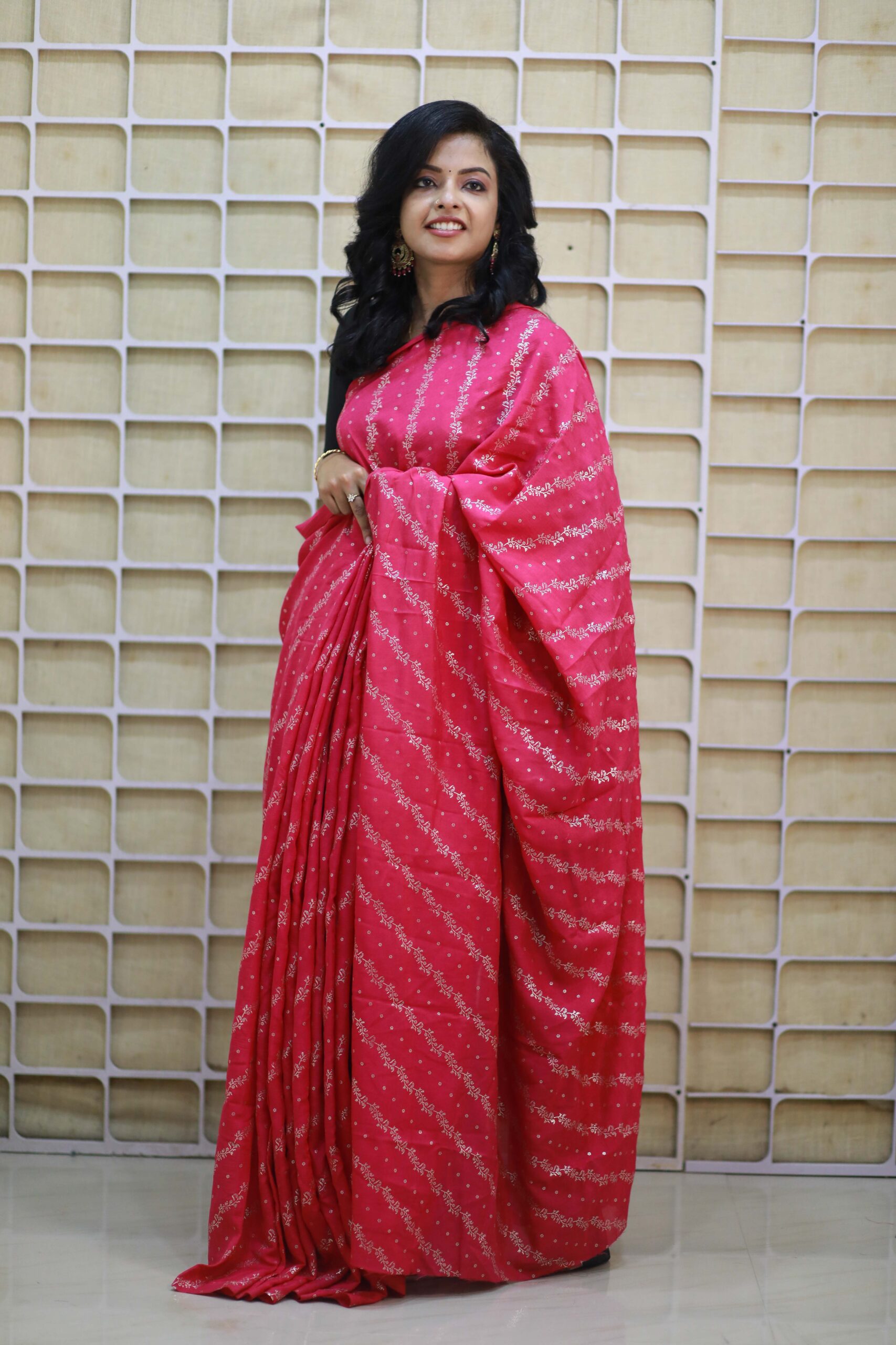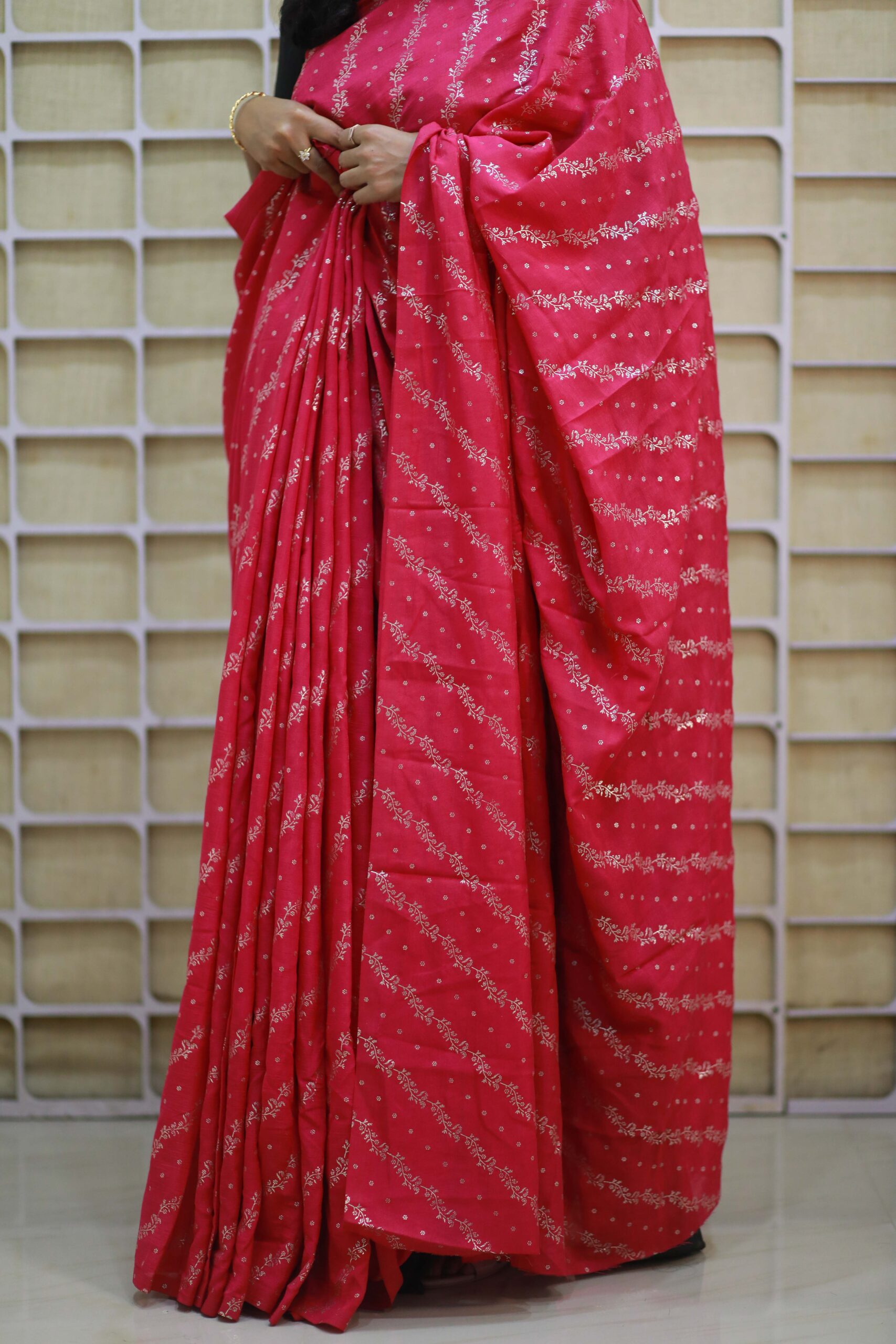 Step into the spotlight with this vibrant Pinky saree, designed for the modern woman who loves a touch of sparkle. Unlike traditional patterns, this saree features dynamic diagonal gold foil vine patterns that flow across the fabric, creating an elongated and graceful look. The lightweight, high-sheen fabric catches the light beautifully, making it an ideal choice for evening parties and receptions.